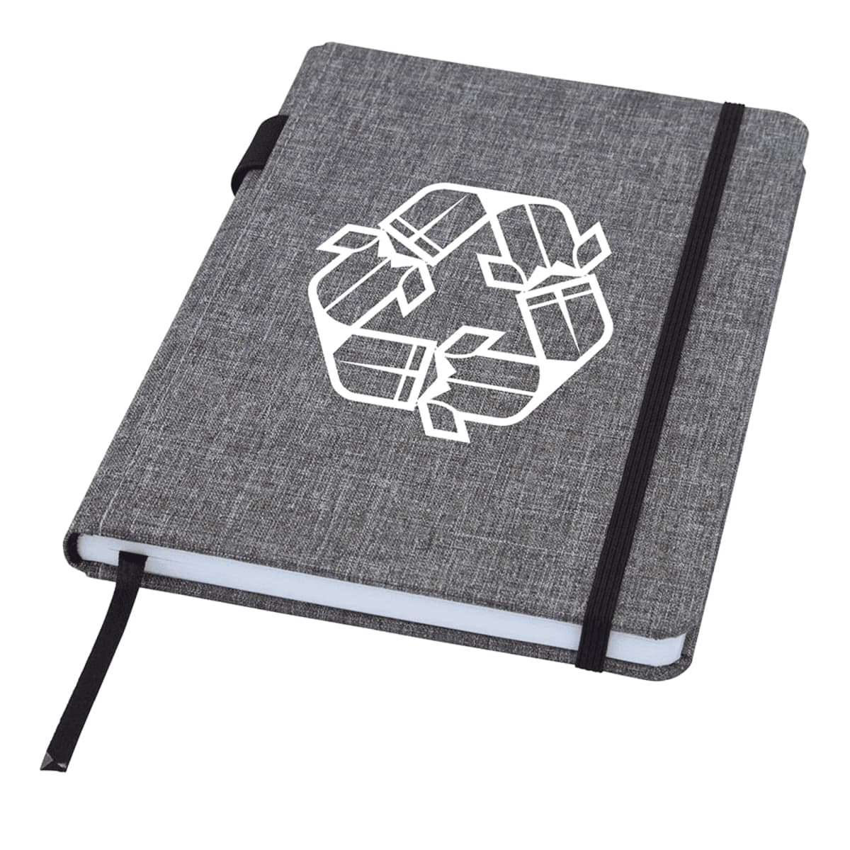 Buy bulk promotional Onyx A5 Recycled Notebooks. Are you an eco-warrior looking for a sustainable addition to your office setup? Our Onyx A5 Recycled Notebooks are perfect for you! Beautifully crafted with an eye-catching cover made of RPET fabric, these notebooks will help you bring a touch of sustainability to your workspace or home office. Featuring 96 sheets of 70 g/m recycled paper with a lined layout and sleek pen loop, it’s the ideal companion while brainstorming ideas or creating presentations. There’s even a ribbon marker so you can easily pick up where you left off. It?s the perfect blend of style and practicality! Most importantly, when you buy our Onyx A5 Recycled Notebooks, you’re helping reduce waste and your environmental footprint. So why wait? Get your hands on this stylish and eco-friendly notebook today!